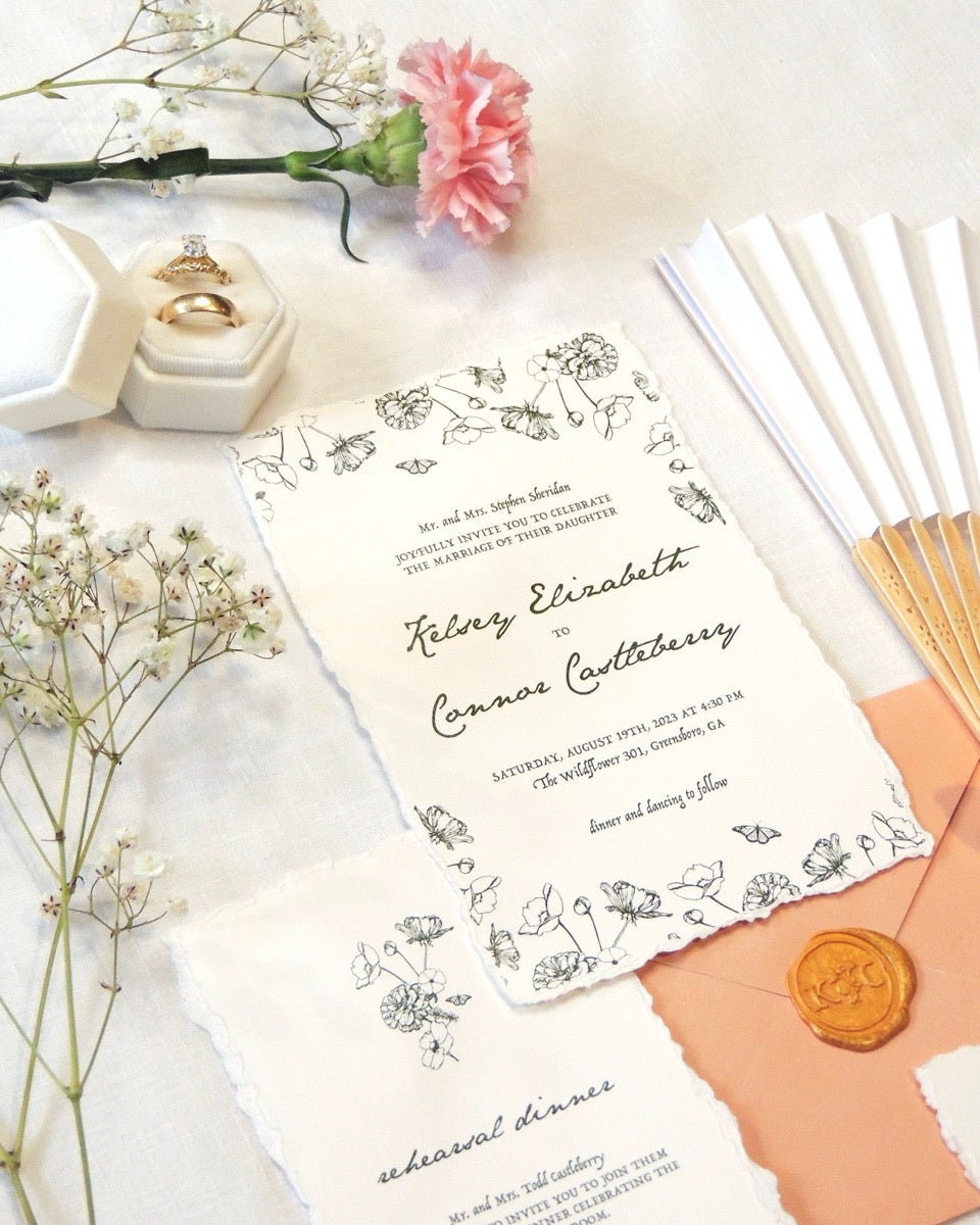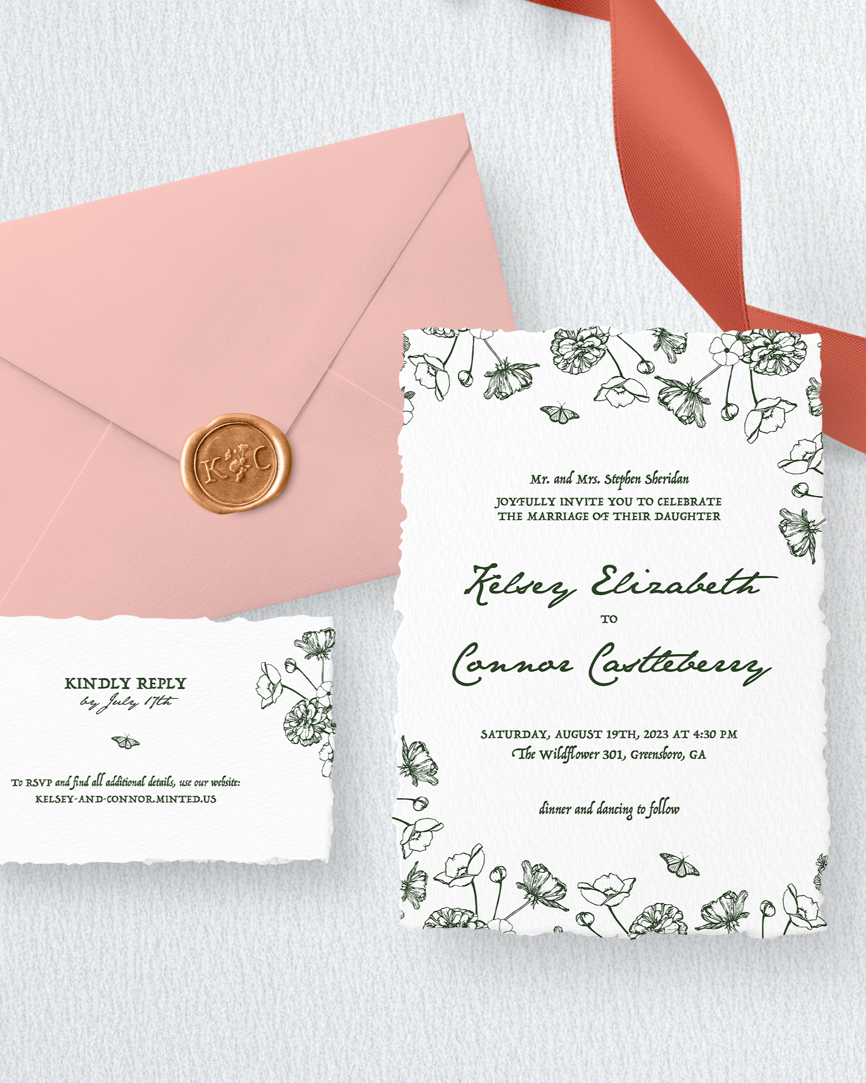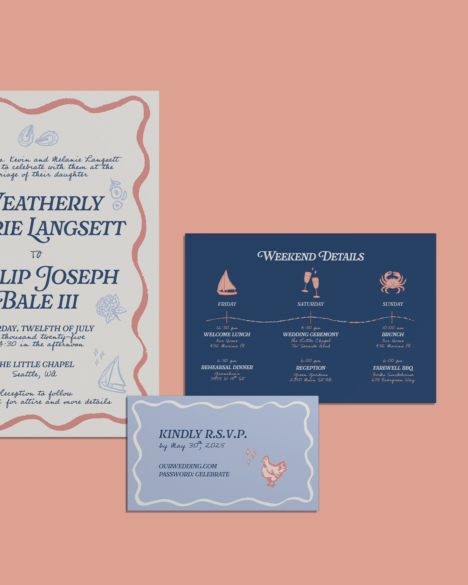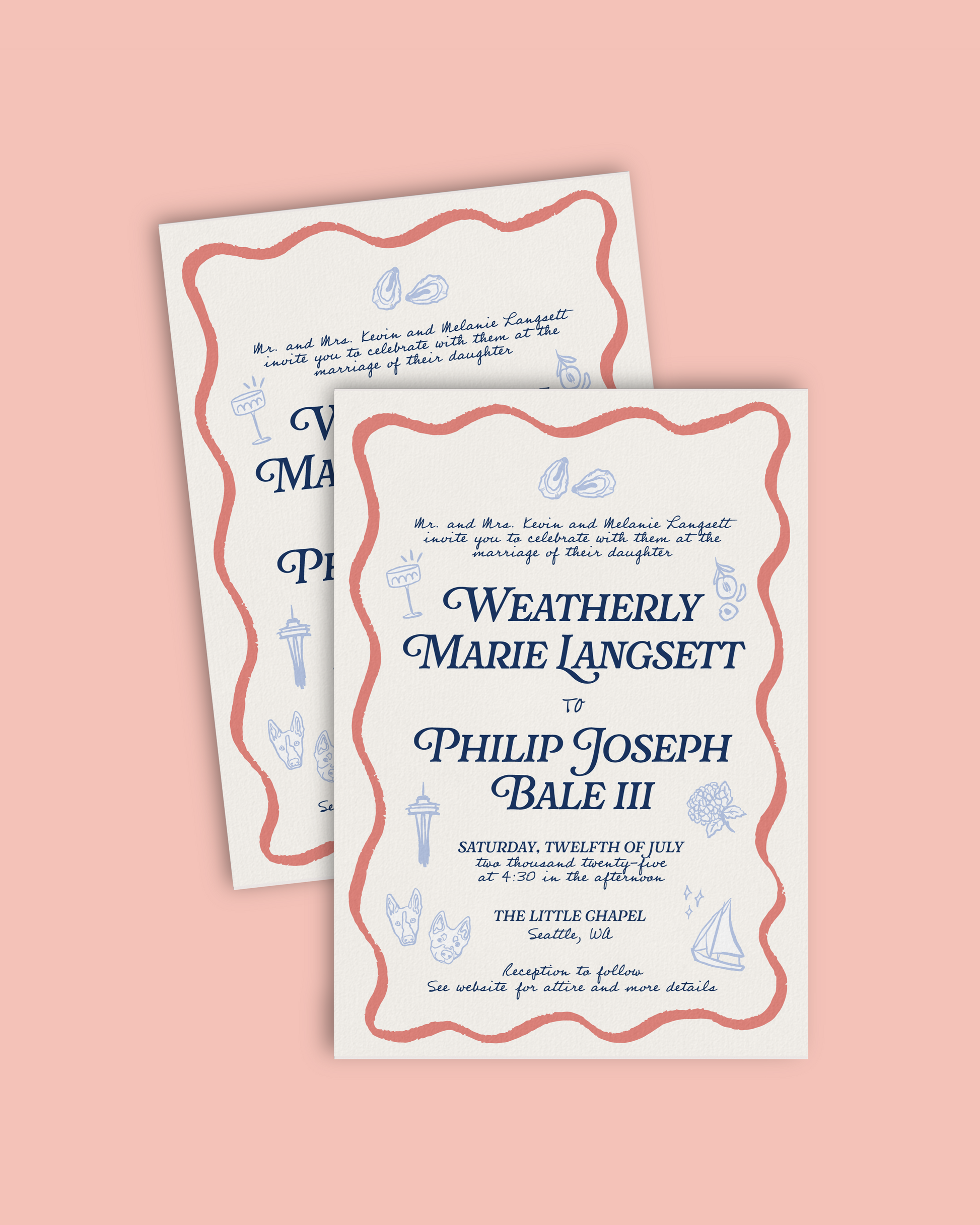 Please note, wedding stationery has a minimum deposit—the intricacy of your vision will determine the total price, which we will talk through before starting. Once the final invites are sent to print, there will be a second payment. This process includes unlimited rounds of revisions!